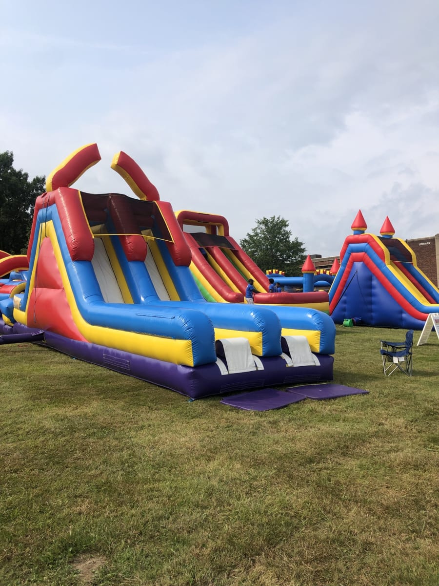 The attention-getting Ninja dry slide is sure to bring everyone running and keep them sliding at your next event! Participants can climb up 18 feet for a sleek and fast drop to the cushioned bottom, guaranteed to satisfy thrill seekers young and old. With a colorful red, purple, green and yellow theme, this dry slide will match any theme or décor, and be an eye-catching attraction. Riders will enter from the back of the inflatable play structure and make the climb and slide down one of the two dual slides, ready to run around for a second turn. L35' x W12.5' x H18' 429LB