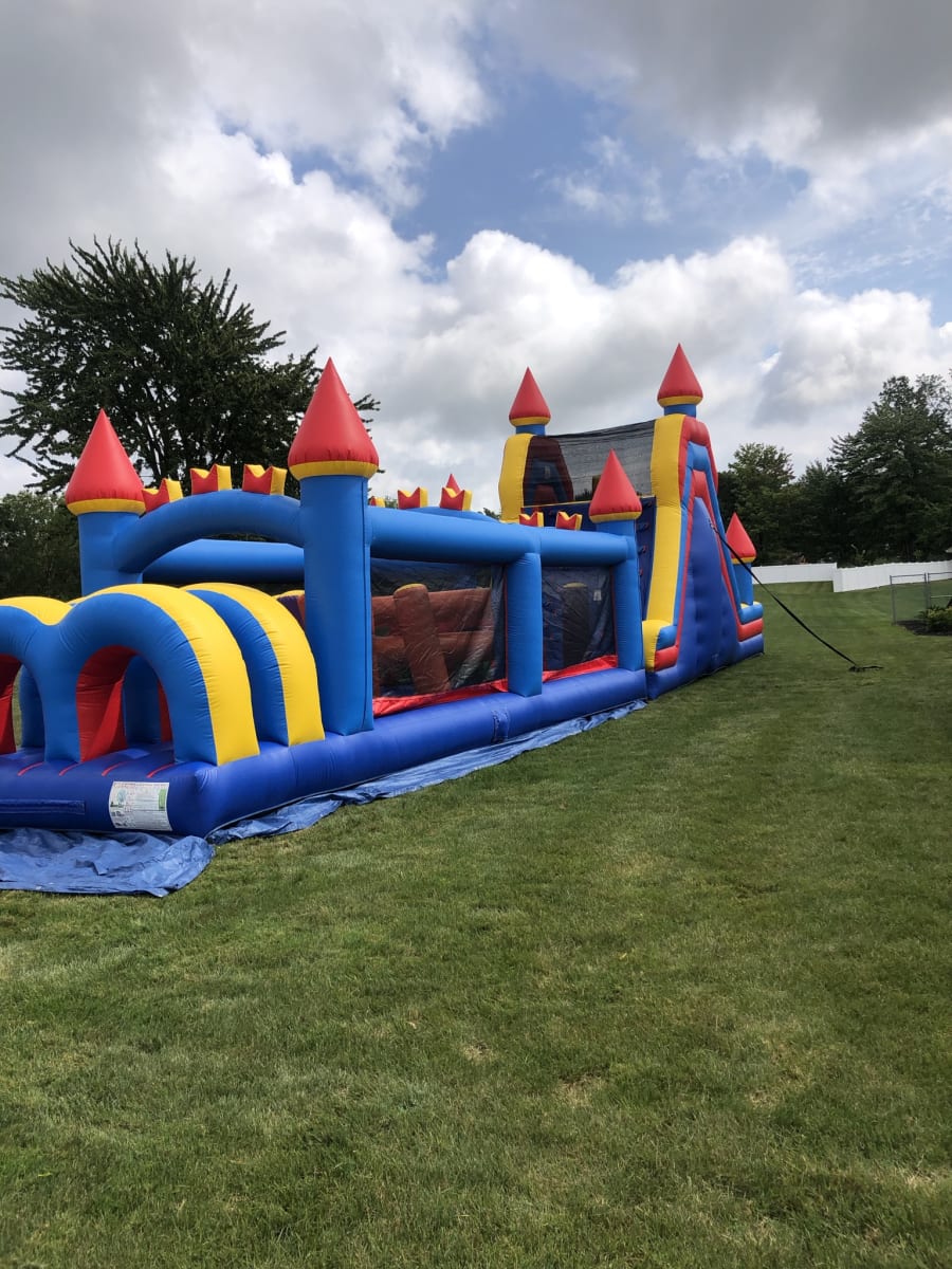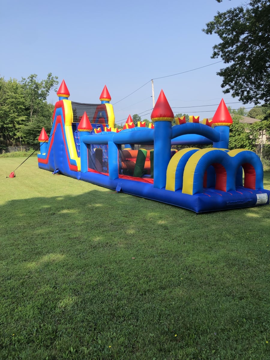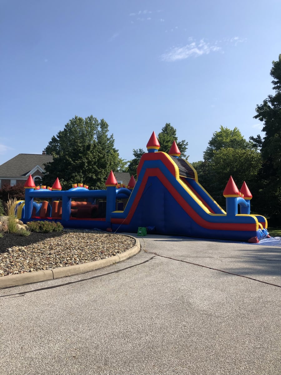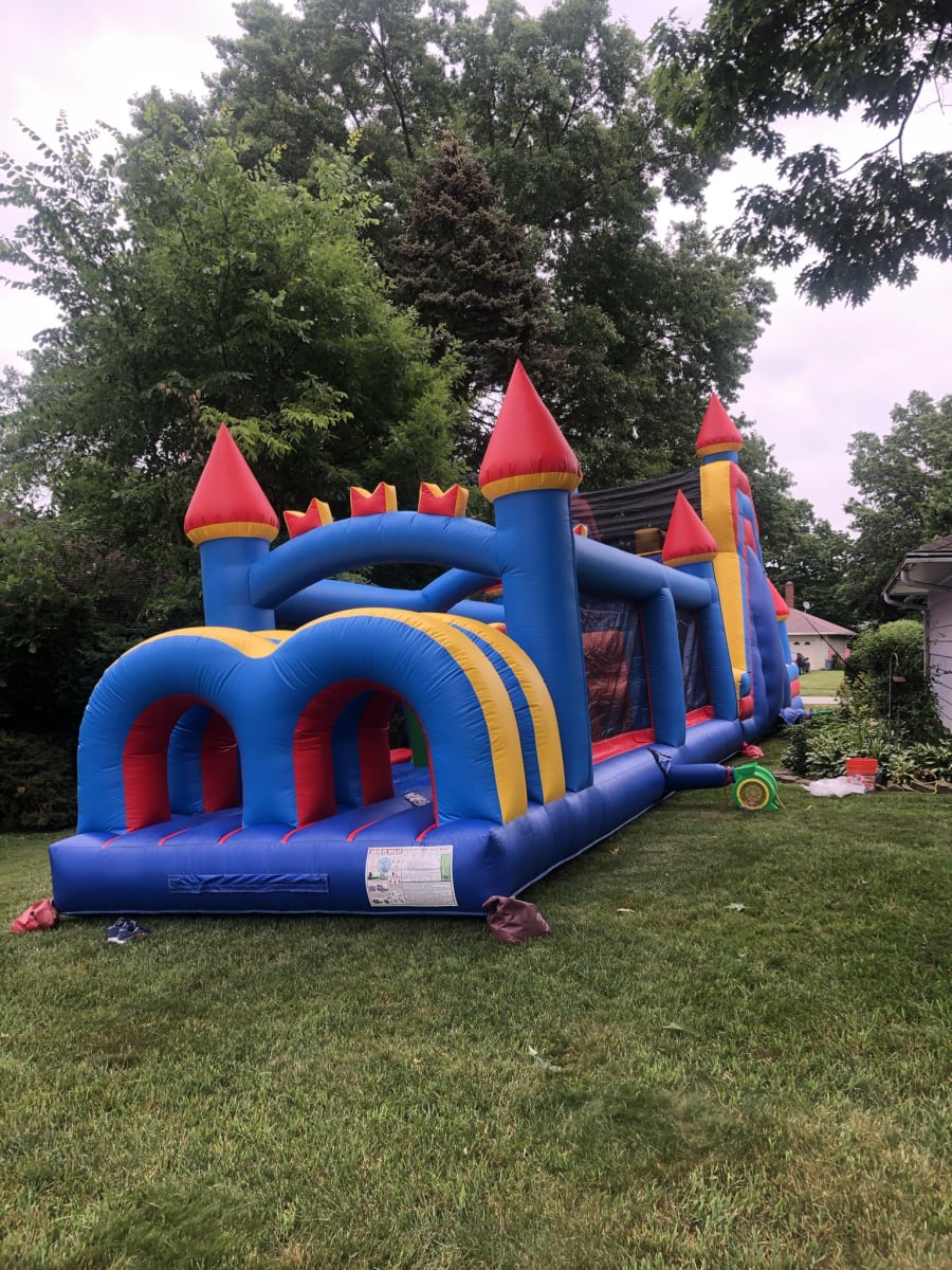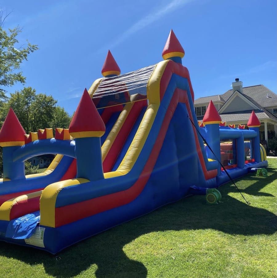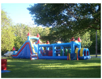 This ride is a 60 foot long maze of fun with a beautiful design that is sure to attract any passerby. The Castle Course is an eye-catching piece that does not skimp on any of the fun and challenges. Its entrance welcomes each participant into his lane through an arching tunnel that gives way to a series of pop up obstacles to push past. Once through, the challengers must pass a pair of horizontal hurdles then dive into and crawl through a tunnel. After exiting the tunnel, the participants push through another set of pop ups before enjoying an 11 foot wall climb and slide down the end of the Castle Course. L60' x 12.6' x H18' 800LB